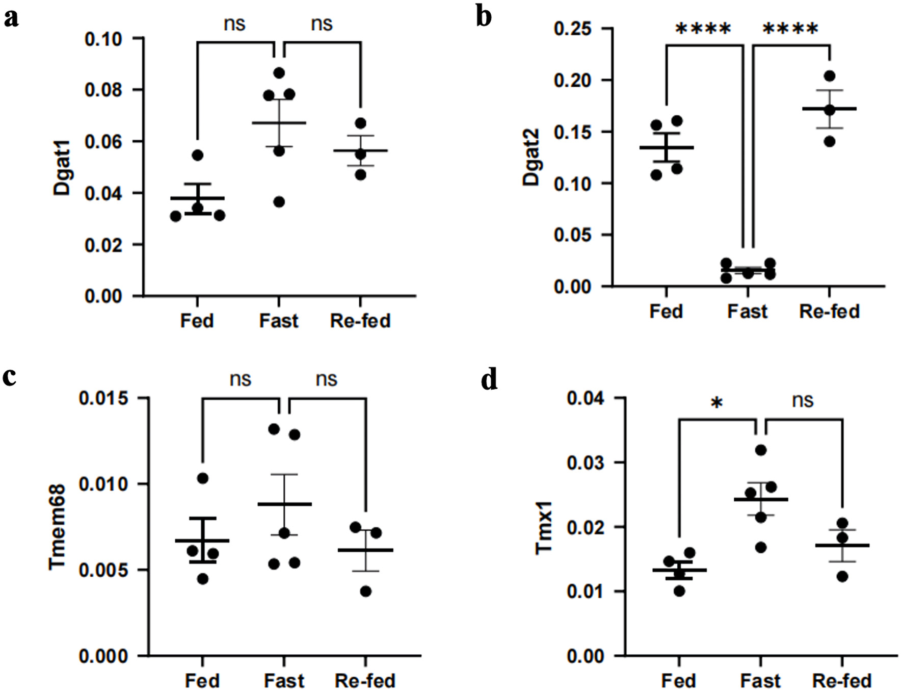 ![]() Click for large image | Figure 1. Liver expression of Dgat1, Dgat2, Tmem68, and Tmx1. Hepatic mRNA levels of (a) Dgat1, (b) Dgat2, (c) Tmem68, and (d) Tmx1 in mice with ad libitum feeding, 20-h fasting, and 4-h refeeding following the fasting (n = 4, 5, 3, for the fed, fasting, and re-fed groups, respectively). Data are represented as mean ± SEM. *P < 0.05; **P < 0.01; ***P < 0.001; ****P < 0.0001. ns: non-significant; SEM: standard error of the mean. |